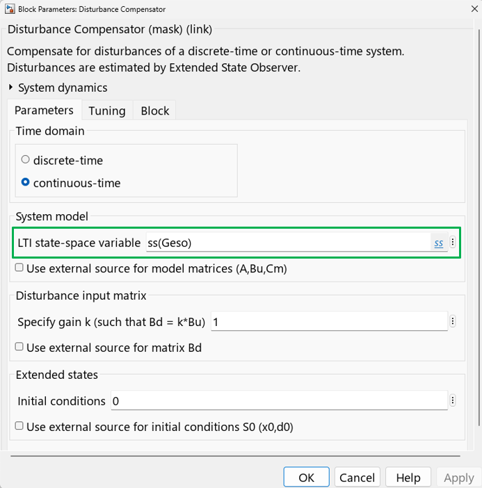 For more information on how to obtain the nominal model , see the Design ADRC for Multi-Input Multi-Output Plant example. The nominal model can be specified in the Disturbance Compensator block as follows.