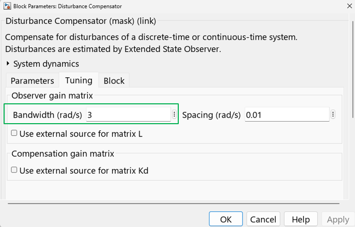 Specify the observer bandwidth for the "Disturbance Compensator" block.