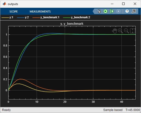 open_system(mdl + "/outputs")The design with disturbance compensation shows improved disturbance rejection compared to the benchmark MPC. The outputs converge more quickly to their reference values, though this comes at the cost of larger control effort.