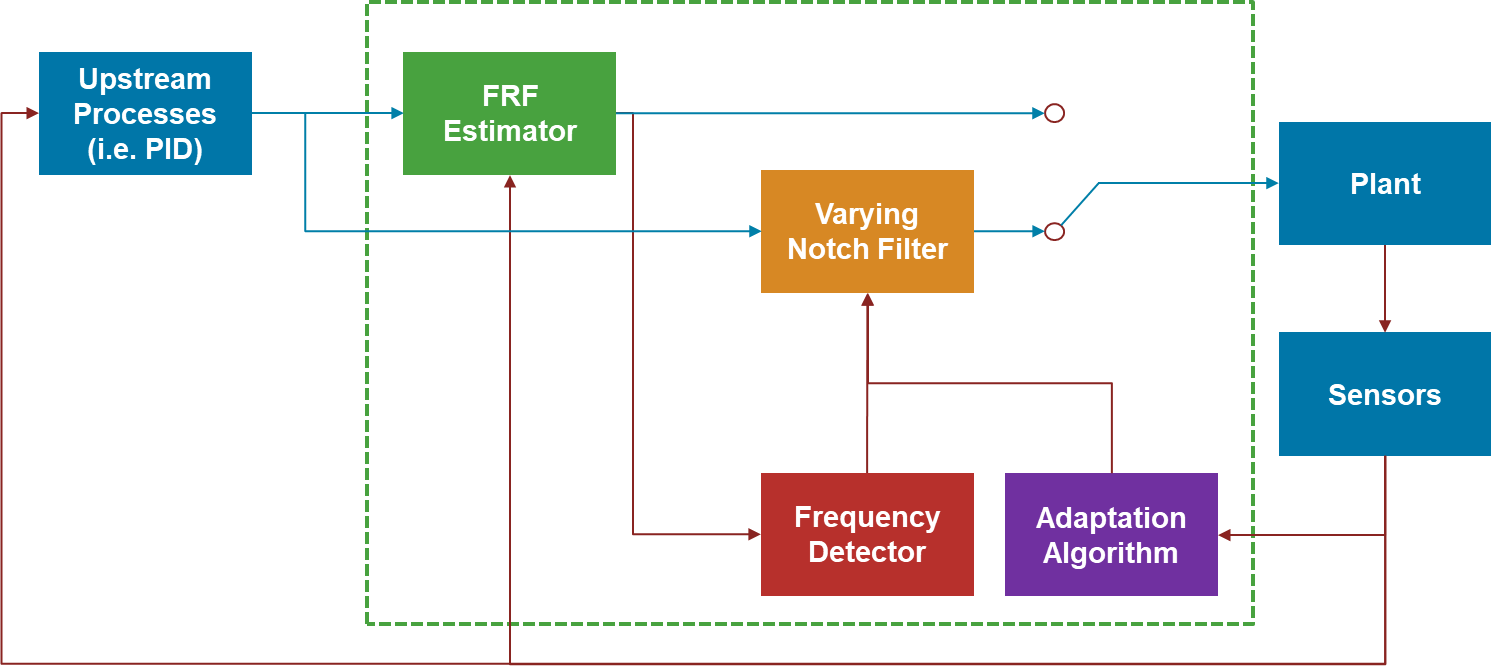 Using the ESC, FRE, and peak detection algorithm together, along with the Discrete Varying Notch Filter block, an adaptive notch filter (ANF) can be created. This ANF will change its depth, width and frequency based on the ESC algorithm and the peak detector.