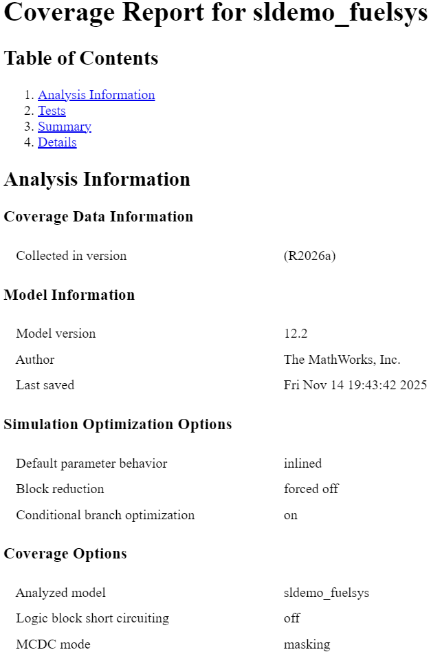 If you analyze coverage for your model using the Run button, Simulink® Coverage™ creates a model coverage report for the specified model named model_name_cov.html. The Simulink Coverage report opens in the Coverage Details pane of the Simulink window.