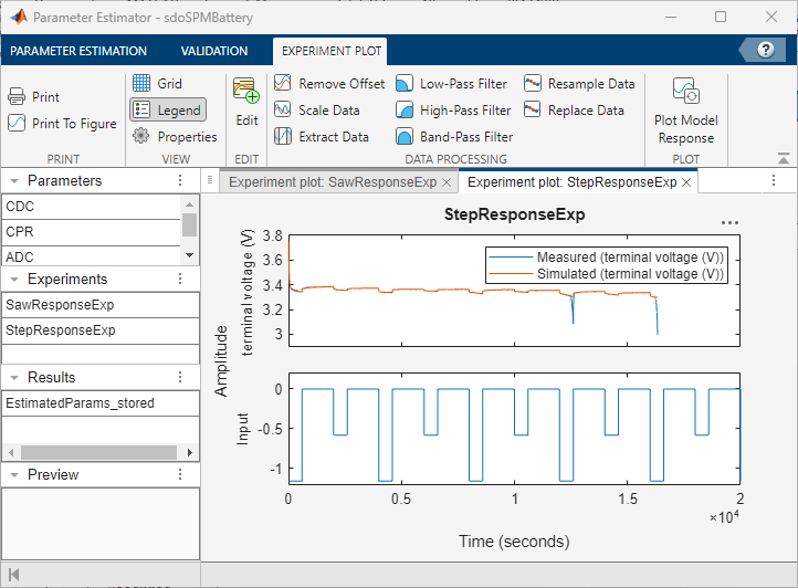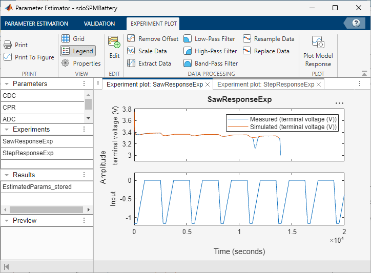 In this example, the saved session estimates the model parameters by fitting the model response to the measured data from two experiments. The StepResponseExp experiment uses an alternating stepped response current profile and the SawResponseExp experiment uses a truncated sawtooth current profile. The current profiles and the corresponding measured data in the two experiments are hypothetical. It is usually necessary to carefully design a current profile such that the measured voltage encodes enough information for estimating battery model parameters.