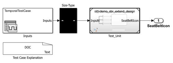 [~, harnessModelFilePath] = sldvmakeharness('sldvdemo_sbr_extend_design',[],[],true); [~, harnessModel] = fileparts(harnessModelFilePath); sigEditorBlk = [harnessModel '/Inputs']; fileName = get_param(sigEditorBlk, 'FileName'); tcData = load(fileName); % Prepare a test case of length 5 seconds TemporalTestCase = tcData.TestCase_1; TemporalTestCase{1}.Values.Speed = timeseries(fi(zeros(2,1), 0, 16, 2), [0;5], 'Name', 'Speed'); TemporalTestCase{1}.Values.SeatBeltFasten = timeseries(false(2,1), [0;5], 'Name', 'SeatBeltFasten'); TemporalTestCase{1}.Values.KEY = timeseries(zeros(2,1,'int8'), [0;5], 'Name', 'SeatBeltFasten'); save(fileName, 'TemporalTestCase'); % Set TemporalTestCase as active scenario set_param(sigEditorBlk, 'ActiveScenario', 'TemporalTestCase');