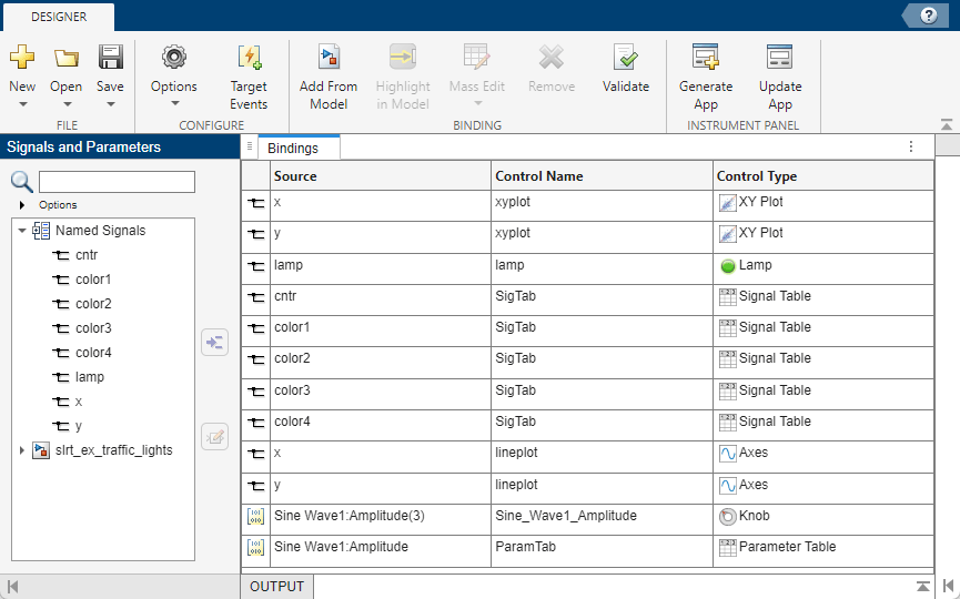 This example shows how to create an Instrument object and apply Instrument object methods. This example uses real-time application slrt_ex_traffic_lights.mldatx and includes the signals that are connected to the instrument object.