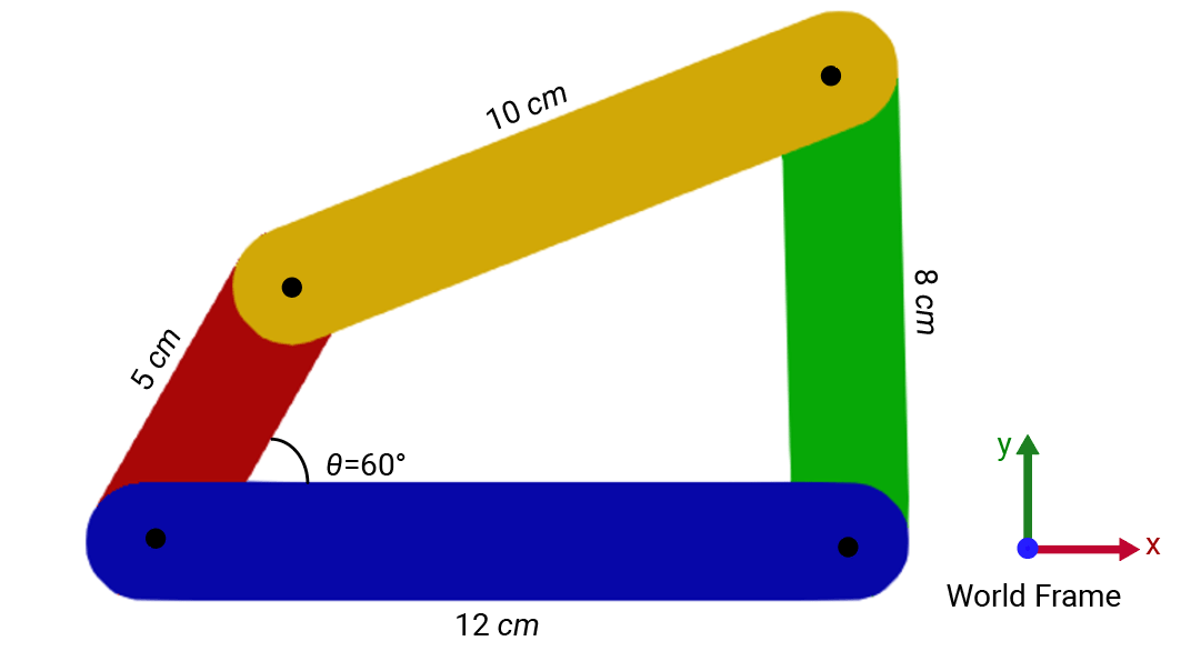 먼저, 그림에 따라 각 링크의 길이와 색을 지정합니다. simscape.Value 객체와 요소를 3개 가진 [R G B] 벡터를 사용하여 각 링크의 길이와 색을 지정합니다.