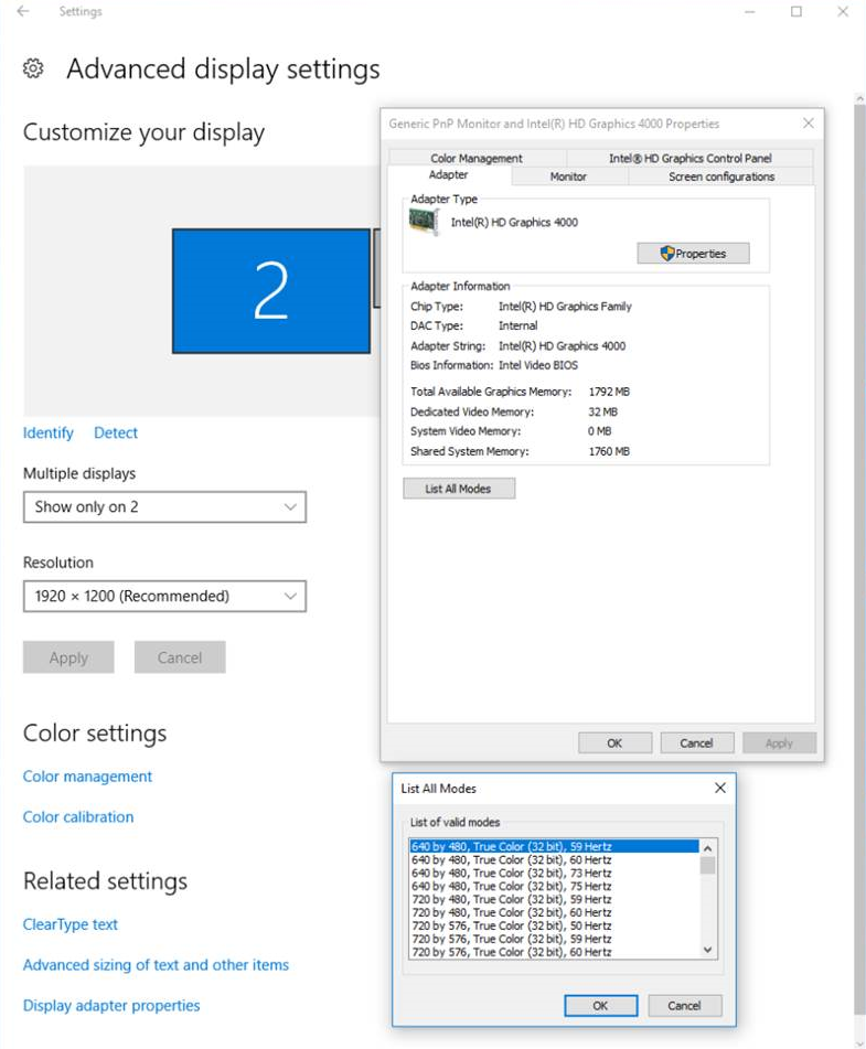 • Select 640 by 480, True Color (32 bit), 60 Hertz from the list.