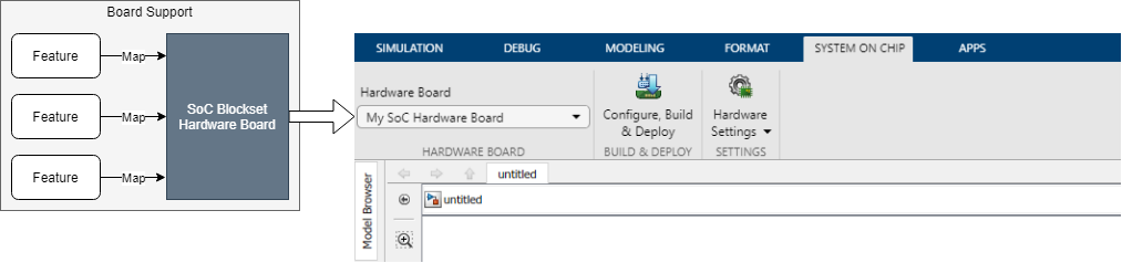 Creating new board support adds and registers tools, libraries, configuration, source and header files, and hardware board parameters to the Simulink® environment. Groups of tools, configurations, and files that serve a specific purpose define a features of board support. These features, such as external mode or kernel profiling, can be mapped to a hardware board, which enables those features and makes them visible in the Simulink configuration parameters and SoC builder app for the associated hardware board. Combined with Embedded Coder® and HDL Coder™, you can deploy a model as compiled C/C++ and HDL code to an SoC device on that supported hardware board.