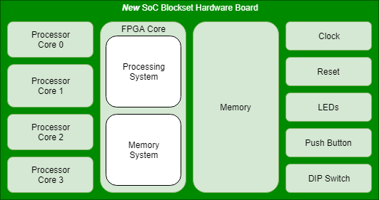 Board support allows new hardware boards to be added to the selection of available hardware boards in SoC Blockset™. Adding board support allows you to select the new hardware board in a model and simulate with the features of SoC Blockset, such as processor-memory-FPGA or I/O device interaction.