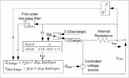 Exp(s) 전달 함수는 충전 및 방전 사이클 동안의 납산 배터리, 니켈-카드뮴(NiCD) 배터리, 니켈-금속 수소(NiMH) 배터리의 히스테리시스 현상을 나타냅니다. 배터리가 충전될 때 지수 전압은 배터리의 충전 상태와 관계없이 증가합니다. 배터리가 방전될 때 지수 전압은 즉시 감소합니다.