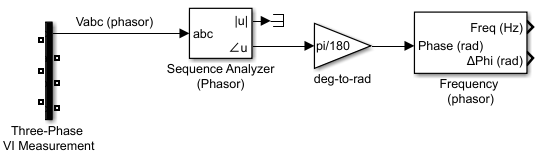이 다이어그램은 3상 전압 페이저의 주파수를 측정하는 Frequency (phasor) 블록의 예제를 보여줍니다.