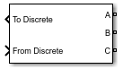 The Phasor-to-Discrete Interface block send the voltages measured at the A, B, and C terminals of the block to the Discrete-to-Phasor Interface block. It also phase shift the phasor voltages received by the Discrete-to-Phasor block. Because the Phasor-to-Discrete Interface block and the Discrete-to-Phasor Interface block act together to model a single decoupling system, the values specified for the resistance Rc, nominal frequency F, and sample time Ts parameters must be the same in the two blocks.