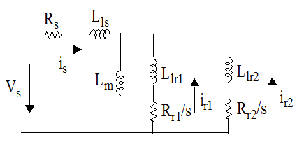 The following figure shows the steady-state equivalent circuit of a double-cage asynchronous machine.