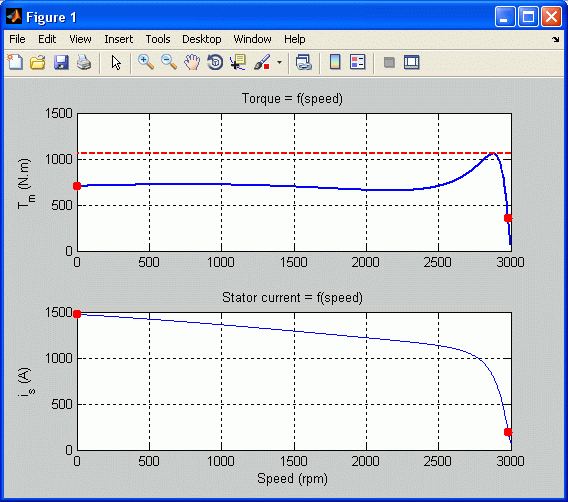 To draw graphs of torque versus speed and stator current versus speed, enter the following commands: