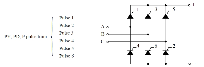 The pulse ordering in the pulse trains corresponds to the natural order of commutation of a three-phase thyristor bridge, as shown in the following figure.