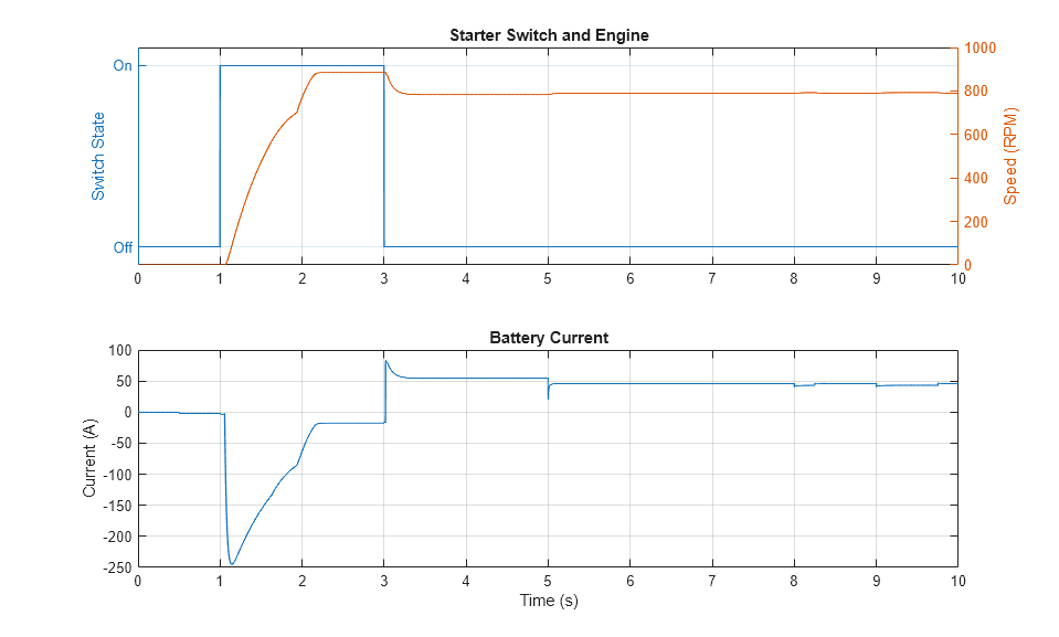 아래 플롯은 자동차 전기 네트워크에 대한 시동 시퀀스를 보여줍니다. 스타터 모터가 켜지면 엔진 시동을 위해 배터리에서 전류를 끌어옵니다. 조명 및 다른 전기 부하가 켜지고 꺼짐에 따라 배터리에서 끌어오는 전류가 달라집니다.