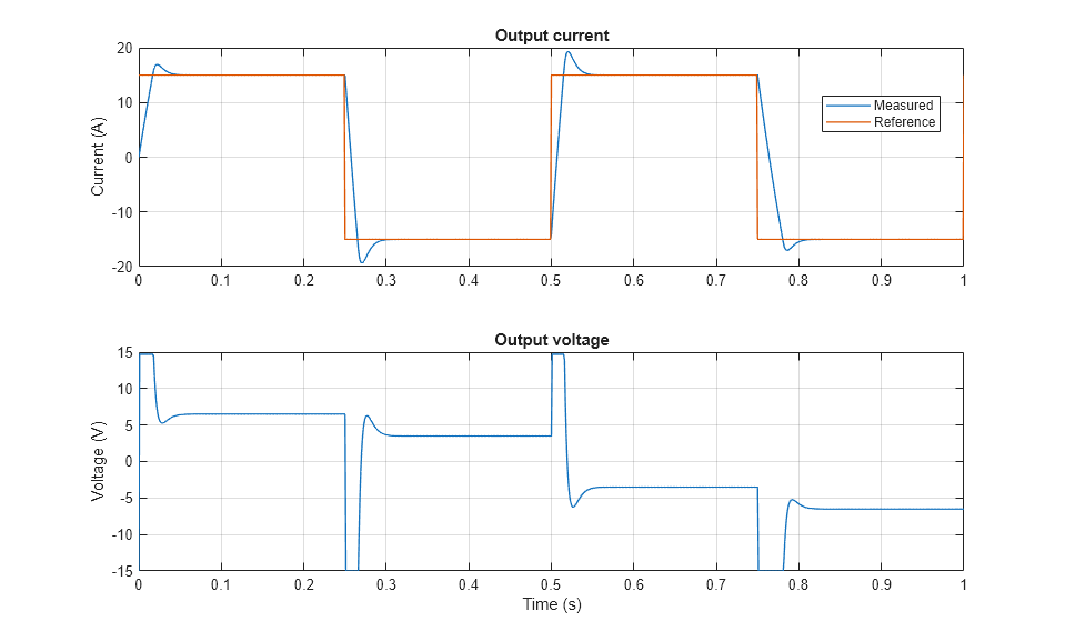 아래 플롯은 테스트에서 요청된 전류와 그 측정값을 회로의 출력 전압과 함께 보여줍니다.
