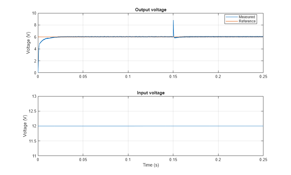 이 예제에서는 벅 컨버터의 출력 전압을 제어하는 방법을 보여줍니다. 듀티 사이클을 조정하기 위해 Control 서브시스템은 PI 기반 제어 알고리즘을 사용합니다. 입력 전압은 시뮬레이션 과정 전체에서 일정한 것으로 간주합니다. 가변 저항기가 시스템에 부하를 제공합니다. 총 시뮬레이션 시간(t)은 0.25초입니다. t = 0.15초에서 부하가 변경됩니다.