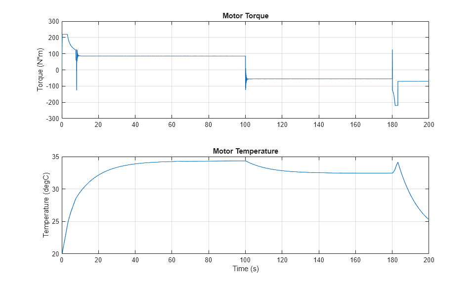 아래 플롯은 전기차의 PMSM 모터에 의해 생성되는 토크와 이 모터의 온도를 보여줍니다. 시뮬레이션의 전반부 동안 모터는 차량을 명령된 속도까지 가속한 후 토크를 계속 가하여 경사로에서 차량을 밀어 올립니다. 시뮬레이션의 후반부 동안 모터는 모터 토크의 부호 변화에서 볼 수 있듯이 발전기 역할을 합니다.