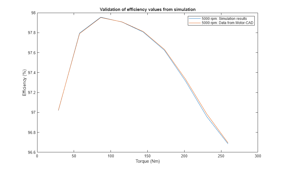 아래 플롯은 파라미터화된 Simscape Electrical 블록을 사용한 시뮬레이션 결과에서 추출한 효율 값을 보여줍니다.