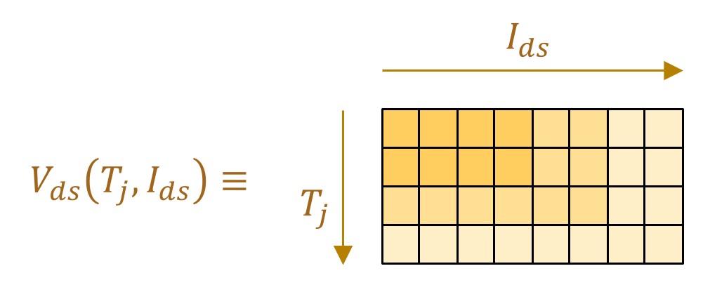 Extracted data often requires processing to make it compatible with the lookup table requirements of the block. Common issues include mismatched axes, non-ascending values, NaN values, and data orientation differences. This illustration shows the expected structure of the 2D lookup table. The drain-source voltage,, is a function of the drain-source current, , and junction temperature, . The voltage varies with current along the x-axis and with temperature along the y-axis.