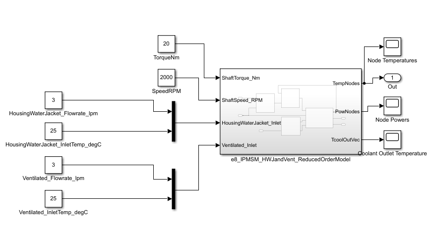 This example shows how to import an Ansys Motor-CAD motor model in Simulink®. This example also contains a previously generated Simulink reduced-order thermal model (SROTM) of an interior permanent magnet synchronous motor (IPMSM) with housing water jacket and self-ventilated cooling. You can download this model in MATLAB® or access it from MATLAB Central File Exchange and GitHub®.