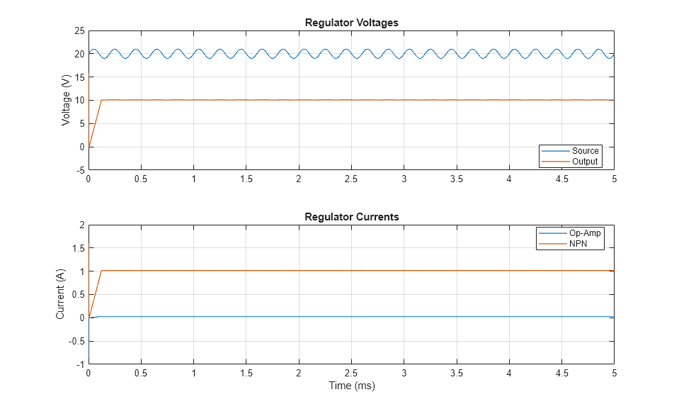 이 예제에서는 개별 컴포넌트로 구성된 단순한 전압 레귤레이터 회로를 보여줍니다. 변동하는 공급은 20V DC와 1V 정현파 변형으로 모델링됩니다. 제너 다이오드 D1은 op-amp의 비반전 입력을 3.2V로 설정합니다. 이에 따라 op-amp가 큰 이득을 가지므로 op-amp 반전 입력 및 출력 또한 3.2V입니다. 따라서 레귤레이터 전압 출력은 3.2*(1000+470)/470=10V가 되도록 조정됩니다. 일반적인 op-amp에서 가능한 것보다 높은 전류를 제공하려면 NPN 양극성 트랜지스터가 필요합니다. 모델은 회로 동작을 확인하고 원하는 전압 조정을 달성할 수 있도록 컴포넌트 선택을 지원합니다.
