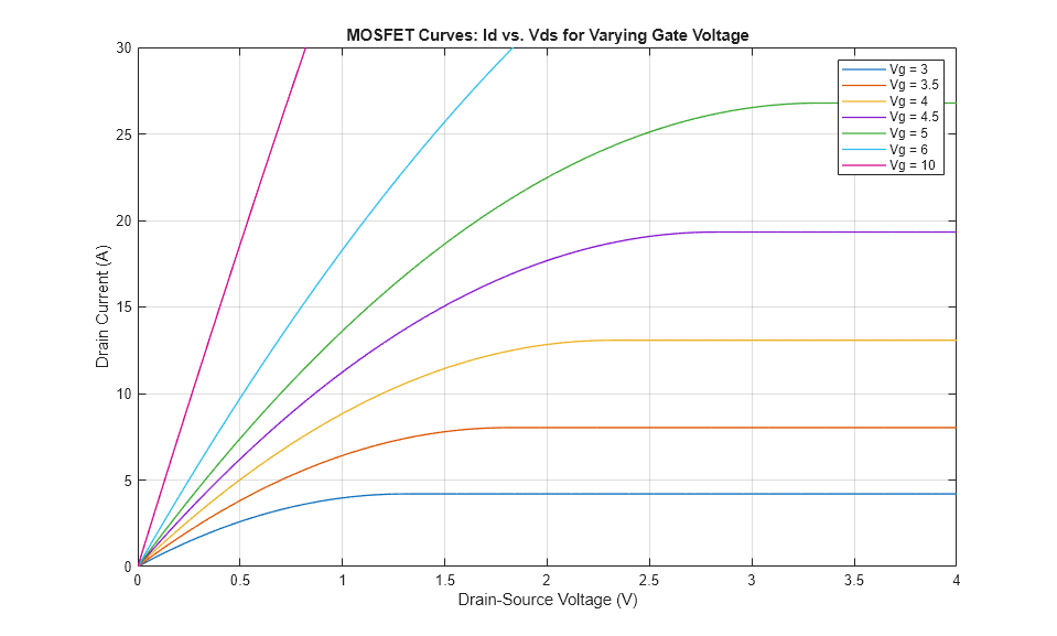 이 유형의 플롯을 제조업체 데이터시트와 비교하여 MOSFET 파라미터의 구현이 올바른지 확인할 수 있습니다. 또한 다양한 음의 Vds 값을 지정하여 역방향 영역의 MOSFET 특성을 검토하는 데에도 이 모델을 사용할 수 있습니다.