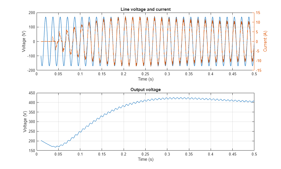 아래 플롯은 선 전압 및 선 전류와 출력 전압을 보여줍니다.