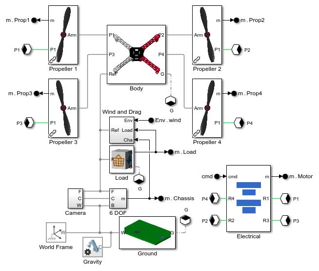 Quadcopter 서브시스템의 마스크 내부를 탐색합니다. 이 서브시스템은 바디와 프로펠러를 모델링하고 쿼드콥터에 작용하는 힘을 모델링합니다.