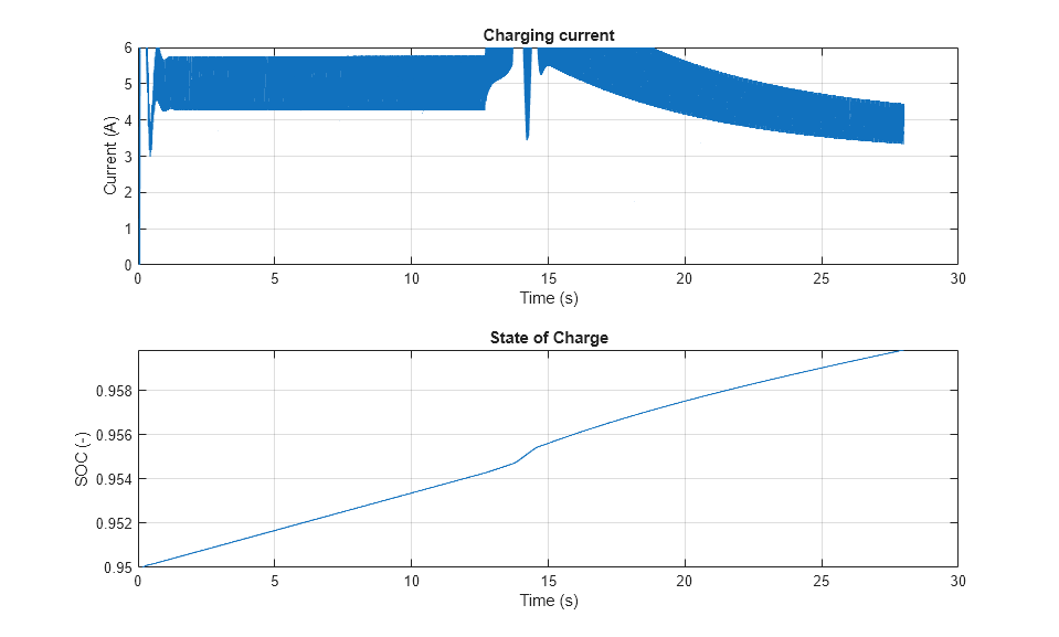 아래 플롯은 배터리 충전 전류를 보여줍니다. 처음에 전류는 일정합니다. 그런 다음 정전압 충전이 시작되면 전류가 감소합니다.