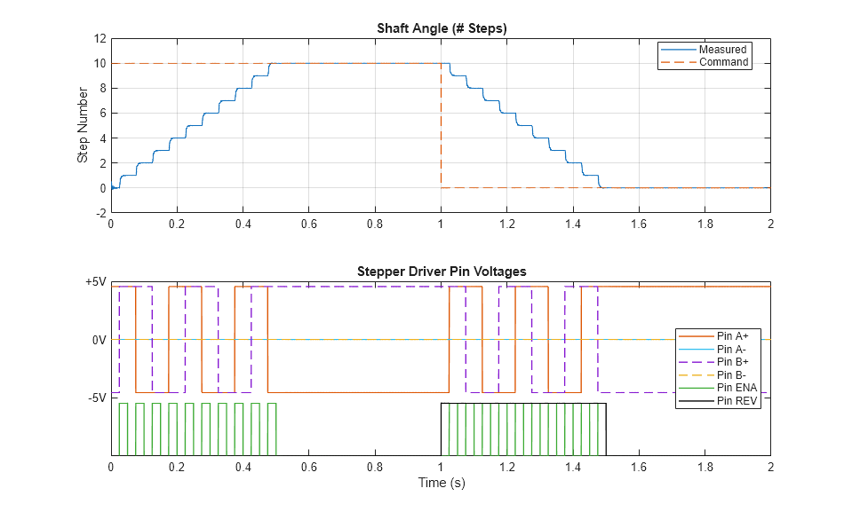 아래 플롯은 스테퍼 드라이버의 핀 상태가 스테퍼 모터의 동작에 어떤 영향을 미치는지 보여줍니다. 이 드라이버는 인에이블(ENA) 신호가 Stepper Motor Driver 블록의 인에이블 임계 전압 파라미터 값을 넘어 상승할 때마다 스텝을 시작합니다.