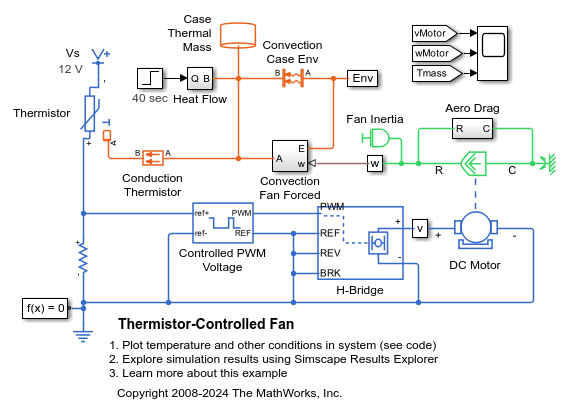 이 모델은 기본적인 열 컴포넌트, 기계 컴포넌트, 전기 컴포넌트를 사용하여 서미스터로 제어되는 팬을 모델링하는 방법을 보여줍니다. 열 발생 장치가 시간 0에서 2와트를 생성하기 시작하고 40초 후에 20와트로 증가합니다. 이에 따라 서미스터가 가열되면서 저항이 감소하며, 이는 PWM 기준 핀의 양단 간 전압을 높입니다. 이로 인해 PWM 주파수가 증가하고, 결과적으로 평균 모터 전류가 증가하여 팬 속도가 빨라집니다. 팬 속도가 빨라지면 장치의 대류 냉각이 증가하여 장치의 온도 상승이 완화됩니다.
