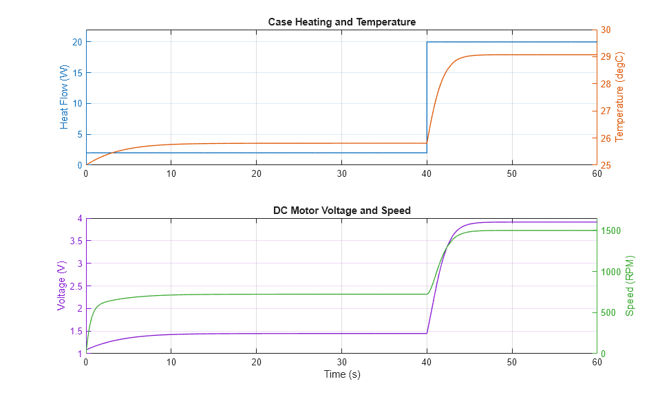 아래 플롯은 서미스터로 제어되는 모터의 전기적, 기계적, 열적 동작을 보여줍니다. 서미스터의 온도가 변화함에 따라 모터에 적용되는 전압이 변하고, 이로 인해 모터의 속도와 케이스 표면의 대류 열 전달이 바뀝니다. 시스템은 짧은 시간이 지난 후 정상 상태에 도달합니다.