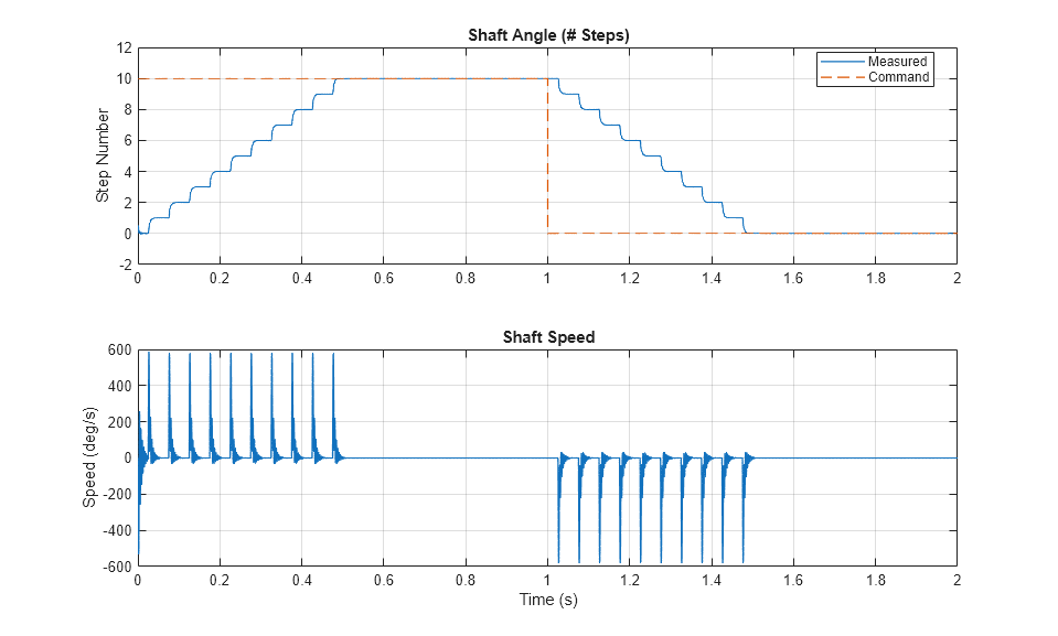 아래 플롯에서는 위치 제어기를 사용할 때 모터 샤프트 각도와 요구 신호를 비교합니다. 위치 제어 알고리즘은 위치 명령을 스텝 수로 받으며, 이 명령을 스테퍼 모터 드라이버를 제어하는 펄스 열로 변환합니다. 각속도 플롯에 표시된 스파이크는 샤프트가 명령된 위치에 정착할 때 생깁니다.