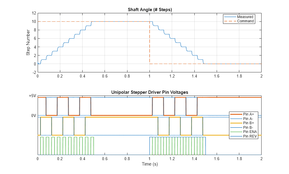 아래 플롯은 스테퍼 드라이버의 핀 상태가 스테퍼 모터의 동작에 어떤 영향을 미치는지 보여줍니다. 이 드라이버는 인에이블(ENA) 신호가 Unipolar Stepper Motor Driver 블록의 인에이블 임계 전압 파라미터 값을 넘어 상승할 때마다 스텝을 시작합니다. 드라이버는 공통 연결 A0 및 B0을 항상 high로 설정하고 필요에 따라 A, A-, B, B-를 접지합니다.