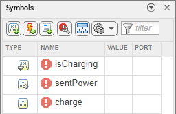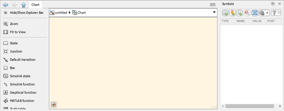 기호 창 — 기본적으로 캔버스 오른쪽에 위치한 창으로, 차트가 나머지 Simulink 모델과 통신할 수 있도록 하는 데이터, 이벤트, 메시지를 여기서 생성하고 관리할 수 있습니다.