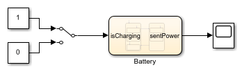 Battery차트로 연결되는 신호 선을 마우스 오른쪽 버튼으로 클릭하고 선택한 신호 기록을 클릭합니다.Battery차트에서 Scope 블록으로 연결되는 신호 선에 대해 이 단계를 반복합니다.
