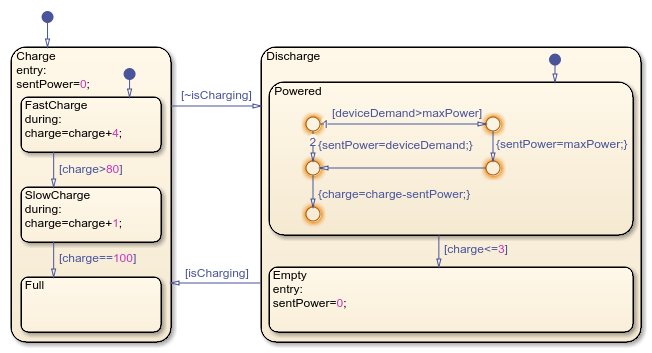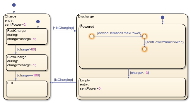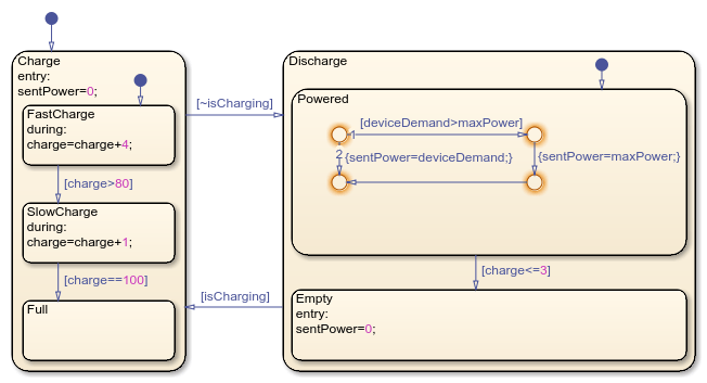 첫 번째 연결점에 있는 숫자는 평가 순서를 나타냅니다. [deviceDemand>maxPower]로 레이블이 지정된 천이의 순서 레이블은 1이며, 이는 첫 번째로 평가됨을 나타냅니다. {sentPower=deviceDemand;}로 레이블이 지정된 천이의 순서 레이블은 2이며, 이는 두 번째로 평가됨을 나타냅니다.