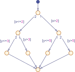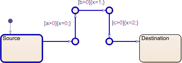 예를 들어, 위 차트에서 천이가 여러 개 있는 경로가 소스 상태를 대상 상태에 연결합니다. 경로상의 모든 조건이 true이면 차트는 x를 차례대로 0, 1, 2로 설정합니다. 그런 다음 동일한 스텝에서 차트는 소스 상태에서 나와 대상 상태로 진입합니다.