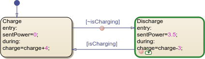 ChargeandDischargerepresent the operating modes of the battery system. The inputisChargingdetermines the active state. The datasentPowerandchargerepresent the output wattage and charge level of the battery.