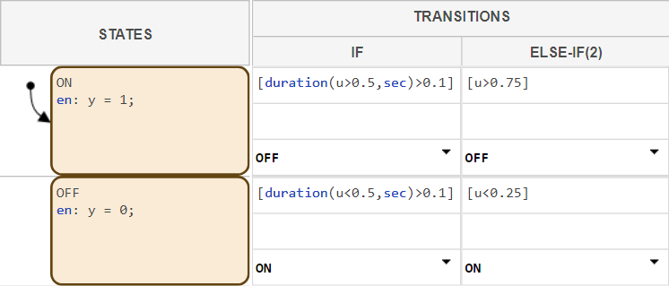 To debounce the input signal, the table uses the duration operator. This operator returns the length of simulation time for which a Boolean expression is true. In this model, the duration operator prevents the table from transitioning from On to Off or Off to On unless u meets the specified condition for longer than 0.1 seconds.