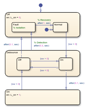 Stateflow® 차트에서 제어기를 모델링하는 경우 제어기가 과도 신호를 수신할 때마다 이에 응답하여 켜지고 꺼지는 식으로 제어기에 부담을 주지 않아야 합니다. 이를 방지하려면, 시간 논리를 사용하여 입력 신호를 디바운싱하고 스위치가 실제로 켜지거나 꺼지는지 확인하는 Stateflow 제어기를 설계하십시오.