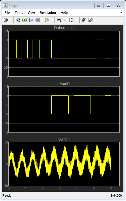 모델을 시뮬레이션합니다. 스코프는 디바운서가 잡음이 있는 입력 신호에서 과도 신호를 어떻게 분리하는지 보여줍니다.