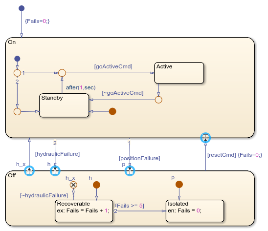 In the actuator charts, the On state represents an actuator without faults. The chart moves to the child state Active when the associated PFCU activates, and moves to the child state Standby when the associated PFCU deactivates.