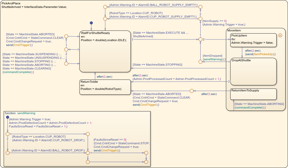 The states at the top level of the chart represent the operating modes of the robot, such as stopping or starting up. The PickAndPlace subchart contains states that represent the movements of an active robot, such as picking up or placing a ball.