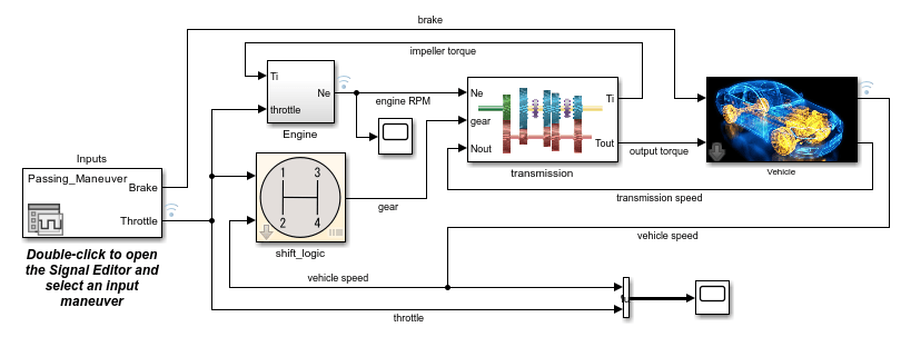 • The Engine, transmission, and Vehicle subsystems model the mechanical operation of the car.