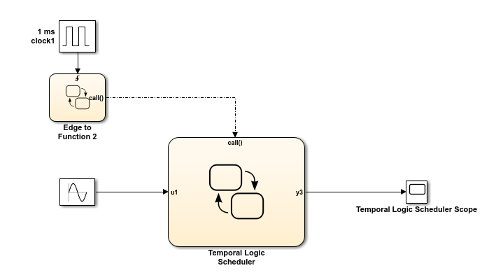 이 예제에서, Temporal Logic Scheduler 차트는 2개의 상태를 포함하고 있으며, 이 두 상태는 시간 논리 연산자 every에 의해 결정된 서로 다른 속도로 3개의 Function-Call Subsystem(A1, A2, A3)이 실행되도록 스케줄링합니다.