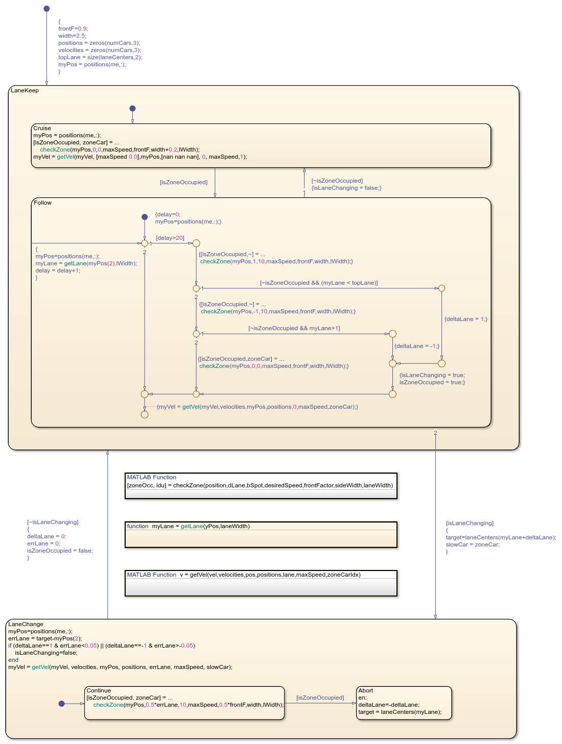 상태 LaneKeep과 LaneChange 간 천이는 isLaneChanging 값에 의해 가드됩니다. LaneKeep 상태에서, 차트는 하위 상태 Follow가 활성이고 차량의 옆에 차선 변경을 위한 충분한 공간이 있으면 이 로컬 데이터를 true로 설정합니다. LaneChange 상태에서, 차트는 차량이 차선 변경을 완료하면 이 로컬 데이터를 false로 설정합니다.