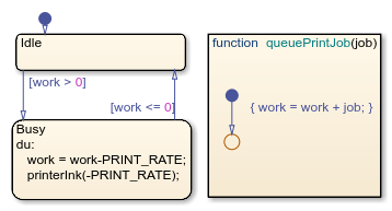 이 예제에서는 네트워크 프린터를 공유하는 3대의 컴퓨터 클라이언트를 모델링합니다. 각 컴퓨터는 처리를 위해 인쇄 작업을 공통 대기열로 보냅니다. 각 컴퓨터 클라이언트는 Simulink Function 블록 addPrintJob을 호출하여 프린터 서버를 호출합니다. 작업 로드에 인쇄 작업을 추가하기 위해 addPrintJob 함수가 Stateflow 차트에서 그래픽 함수 queuePrintJob을 호출합니다. 프린터 잉크의 사용량을 모델링하기 위해 차트는 작업을 처리하고 Simulink Function 블록 printerInk를 호출합니다.