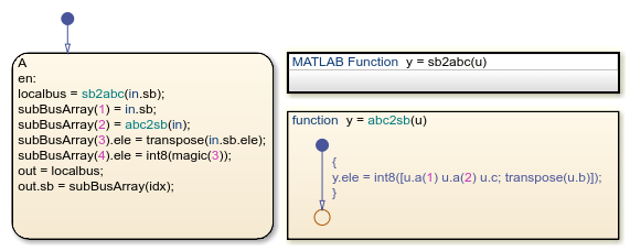 MATLAB® 함수 sb2abc는 유형이 SubBus인 Stateflow 버스를 받아 유형이 BusObject인 Stateflow 버스를 반환합니다. 이 함수는 입력에서 오는 필드 ele의 값을 세 개의 성분인 벡터, 3×2 행렬, 스칼라로 분해합니다. 함수는 이러한 성분을 Simulink.Bus 객체 BusObject와 동일한 필드를 갖는 로컬 MATLAB 에 저장합니다. 그런 다음 함수는 MATLAB structstruct의 값을 출력 버스 y에 할당합니다.